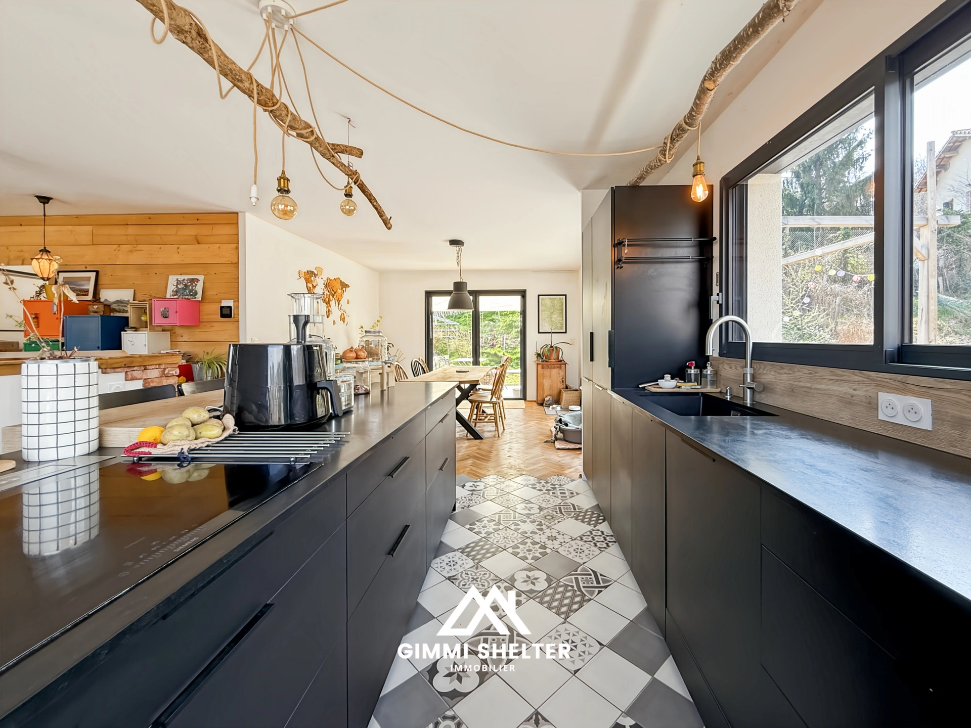 o Belle pièce de vie chaleureuse et lumineuse, sublimée par de beaux parquets en chêne et une circulation fluide entre les espaceso Cuisine équipée Mobalpa, à la fois esthétique et fonctionnelleo Poêle à bois installé l'an dernier, apportant un vrai confort et beaucoup de charme à la pièce de vieo Pompe à chaleur air-eau et panneaux solaires, pour une maison confortable et économe en énergieo Classement énergétique DPE Bo Au rez-de-chaussée : entrée avec meubles sur mesure, WC, salle d'eau, espace de vie, cuisine et bureau de 14 m2 ouvrant sur la terrasse plein sud, pouvant parfaitement faire office de chambreo Au niveau inférieur : trois chambres, une salle de bain avec baignoire et douche, une buanderie ainsi qu'un garageo Un vide sanitaire ouvert sur l'extérieur complète l'ensemble et offre un espace de rangement supplémentaire particulièrement appréciable